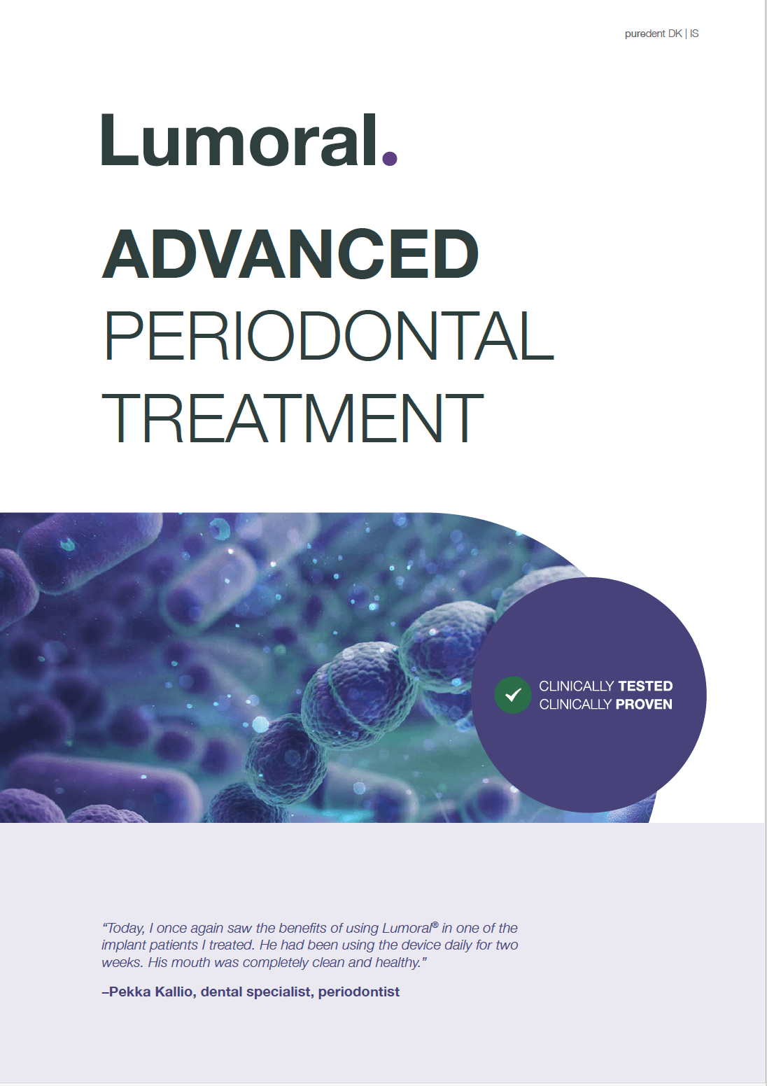 Lumoral er et medical device, der kombinerer advanceret antibakterielt lys og et lysfølsomt stof (ICG) til at nedbryde bakterier i biofilm. Klinikudgaven gør det muligt at tilbyde en anti-bakteriel behandling efter tandrensning.